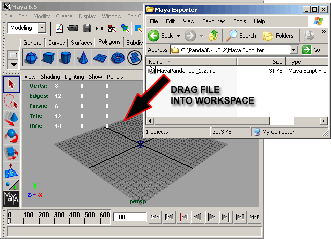 Running the ExporterMaya's exporter can be run from the command prompt or via a graphical panel. The command line utility is called maya2egg. There are multiple versions of it corresponding to different versions of maya. For instance, the version to use for Maya 5.0 is maya2egg5, for 6.0 its maya2egg6 and for 6.5 its maya2egg65. The following is an example of how to convert a file(maya binary .mb) if using Maya 6.0 through the command line. The egg file will contain the filenames of the textures. These texture pathnames will be stored as relative paths, relative to the location of the egg file. For example, let's say that the files are laid out like this: c:\My Models\Maya Files\Character.mb c:\My Models\Egg Files\Character.egg c:\My Models\Textures\Character.png In that case, the command to export the model is: c:\ cd c:\My Models\ maya2egg -o "Egg Files/Character.egg" "Maya Files/Character.mb" Note that Panda Filename Syntax uses forward slashes, even under Windows, and this applies to the exporter as well. After doing this export, the character egg will contain the following texture reference: "../Textures/Character.png" Again, notice that this pathname is relative to the egg file itself. Many artists find it convenient to keep everything in the same directory, to avoid having to think about this. This approach works fine. The above conversion process will turn the character into a static model. Models which are rigged (they have bones to help them animate), skinned (polygons attached to the bones/skeleton), and are animated need to use one of the following options: maya2egg -a model -o eggFileName.egg mayaFileName.mb maya2egg -a chan -o eggFileName.egg mayaFileName.mb maya2egg -a pose -o eggFileName.egg mayaFileName.mb maya2egg -a both -o eggFileName.egg mayaFileName.mb The meanings of these options are: