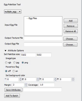 For viewing the video tutorial click here In the beginning Simple Mode should cover the basics of single file exporting. However, once you’ve had to load the application a few times and enter the same settings over and over again, it’s probably time to move on to using the Advanced Mode Tab. Aside from allowing you to have greater control over what specifically gets exported out of a particular Maya scene, this tab allows you to save these options and settings for later use. Also, since everyone has a different set of default exporter options and locations the application allows you to save and load a preferences XML file to load each time the application is launched. The process for exporting from the Advanced Mode tab is largely the same as Simple Mode, but with a few wrinkles. First you should choose your Panda installation directory and Maya version from the Environment Options section. This location is the directory where you told Panda3D to install when running the installer. It is NOT the \bin directory where the maya2egg executable resides. This little wrinkle was necessary to allow multiple operating systems to use the application. The last difference between Simple and Advanced mode for exporting a single file, is that it must be put into the batch list before it can be exported. The Batch List represents the order of the files that are about to be exported. To Add a Maya scene file with its export options to this list simply click Add To Batch (The other utilities in the Extra Utilities section have this same button for simplicity’s sake, but the main Add To Batch button deals solely with the maya2egg tool). After you’ve added any number of scene files with any of the available options to the Batch List you can then click Run Batch and the application will launch the exporter or utility command one by one until it has finished the entire list of items. Another useful feature of the application is that it checks the modified date of every file used as an input for the given utility (ie the .mb file for an exporter batch command, and an egg file for egg2bam). This is handy if you have saved out an entire batch list of 20 files but only need to export the three files you actually changed. The exporter skips any unchanged files by default, but this behavior can be overridden by checking the “Override export changed files” checkbox next to the Run Batch button. Using the Egg-Palletize ToolFor viewing the video tutorial click here Egg-palettize is an optimization tool in Panda for you to group your textures. You can have your textures placed in a single palette. In the advance mode of the GUI, choose the egg-palettize panel. This is the egg-palettize Tool. For using Egg pallettize for a single egg file select that option in the drop down list First, specify the input egg file, the output texture file and the output egg file. The output texture file is where the palette will be put in. And the output egg file is the new egg with the new palette as the texture. Before generating the egg palette, a .txa file should be generated with some attributes listed in the attribute panel. Set palette size: Specify the size of the palette. Imagetype: Image type of the palette. Powertwo flag: Specifies whether textures should be forced to a power of two size when they are not placed within a palette. The default is false. Set background color: Specifies the background color of the generated palette images. The background color is the color of the palette images where nothing is used. The number r, g, b, a channels are range from 0 to 255. The default color is black. Margin: This specifies the amount of default margin to apply to all textures that are placed within a palette image. The margin is a number of additional pixels that are written around the texture image to help prevent color bleeding between neighboring images within the same palette. The default is 2. Coverage: The 'coverage' of a texture refers to the fraction of the area in the texture image that is actually used, according to the UV's that appear in the various egg files. If a texture's coverage is less than 1, only some of the texture image is used (and only this part will be written to the palette). If the coverage is greater than 1, the texture repeats that number of times. A repeating texture may still be palettized by writing the required number of copies into the palette image, according to the coverage area. This attribute specifies the maximum coverage to allow for any texture before rejecting it from the palette. It may be any floating-point number greater than zero. Set this to 1 to avoid palettizing repeating textures altogether. After setting all the attribute, click on Save Attributes button to save all the attributes to a .txa file. Last, add this to batch list, after clicking run batch, the palette will be generated. Egg-palettize for multiple eggs Egg-palettize can also generate a palette image for multiple egg files to share. This palette image has all the textures of multiple egg files to be placed on it. This panel is almost the same as the single egg one. Only for the input egg file can have multiple egg files put into it. Select a added egg file and click Remove button can remove that egg file. Click Remove All button can remove all the added egg files The output is a folder to put all the new eggs. Attributes Panel is the same as the single egg one.