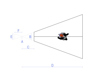 Panda3D Manual: Lenses and Field of ViewEvery Camera has a Lens object that defines the properties of its view. For simple applications, you do not need to think about the lens; you will probably be happy with the default lens properties. However, you will occasionally want to adjust some properties of the lens, such as its field of view, and there are several interfaces to do this, depending on how you want to think about the lens. When you start Panda3D, a default camera and lens are created for you automatically. The default camera object is stored in This default lens will almost always be a perspective lens--that is, an instance of the class The illustration above shows a camera with an ordinary perspective lens observing a model in the world. The camera can only see the part of the world that falls within the black lines; this area is called the lens frustum. In the picture, you can also see the image that the lens is capturing (and that image is shown upside-down, just as it would be in a real, physical camera). This image is just for the purposes of illustration; it isn't really part of a Panda3D camera. It is included to help show the relationship between a Panda3D lens and a real, physical lens. There are several different properties that can be set on a PerspectiveLens. Not all of them are independent; setting some properties will change the values of other properties. Here is an illustration: A. This point is the nodal point or eyepoint of the lens. It is also (usually) the origin, that is, the (0, 0, 0) point of the camera that holds the lens. Normally (in a default Z-up coordinate system), the lens will be looking down the +Y axis, so in the above illustration the +Y axis extends to the right from point A. The plane containing the nodal point, perpendicular the viewing direction (that is, the plane corresponding to the vertical line through point A), is called the camera plane. Although it is possible to change the nodal point or view direction of a lens to some point other than (0, 0, 0) or some direction other than down the +Y axis, it is usually simplest and best just to move the entire camera using the basic NodePath operations like setPos() and setHpr(). B. This angle is the field of view, or fov, of the lens. You can easily change this by setting a new value in degrees with There is actually a separate horizontal field of view and vertical field of view, both of which may be independently controlled with the two-parameter form of setFov: C. This distance is called the near distance or near plane of the lens. Objects that are closer than this to the camera plane will not be rendered. You may set the near distance as small as you like, but it must be greater than 0; and the smaller you set it, the greater the likelihood that you will observe an artifact called Z-fighting, a shimmering of objects that are off in the distance. The default near distance is 1.0, which for many scenes is a reasonable compromise. Of course, the most appropriate value for your scene depends on the nature of the scene (as well as the measurement units in which your scene is modeled). You may change the near distance at any time with the call D. This is the far distance or far plane of the lens. Similar to the near distance, objects that are farther than this from the camera plane will not be rendered. You may set this as large as you like, but like the near distance, setting it too large may result in Z-fighting. (However, the near distance value has a much greater impact on Z-fighting than the far distance value, because of the nature of the math involved.) The default far distance is 1000.0, which is appropriate for small scenes; you may need to set it larger if you have a large scene. You may change the far distance with the call E. This size is the film size of the lens. This is only an abstract concept in Panda3D; it is designed to simulate the actual film size of a physical lens. In a real, physical camera, the lens casts light onto a piece of film behind the lens, and the size of the film impacts the effective field of view of the lens via a mathematical formula that every photographer knows (and which I won't repeat here). In Panda3D, you will probably ignore the film size, unless you are a photographer, or you want to set up a virtual lens that exactly matches the properties of some real, physical lens. You can specify the film size with Setting the film size defines the units to be used for some of the other advanced lens properties, such as the focal length (below) and the lens offset. For instance, a 35mm camera exposes a rectangle on the film about 24mm x 36mm, so if you wanted to simulate a 35mm camera, you would use F. This distance is the focal length of the lens. Like film size, this is only an abstract concept in Panda3D, but it is a very important concept in a real, physical camera. Technically, it is the distance between a lens's nodal point or camera plane and its focal plane or film plane, and it affects the field of view of the lens. In real photography, lenses are typically described by their focal length, rather than by their field of view. You can set the focal length via G (not pictured). The final important property of a lens is its aspect ratio. This is the ratio of the width to the height of the image produced by the lens. It is almost, but not quite, the same as the ratio of the horizontal field of view to the vertical field of view. (It is not quite this, because a perspective lens is not linear in proportion to the angle.) Normally, you will want the aspect ratio of the lens to match the aspect ratio of your window; if it is something different, the image may seem stretched or squashed. You can set the aspect ratio explicitly via Interplay of lens propertiesNote that, as mentioned above, several of these properties are interrelated. In particular, the field of view, focal length, and film size are closely tied together. Setting any two of these three properties 